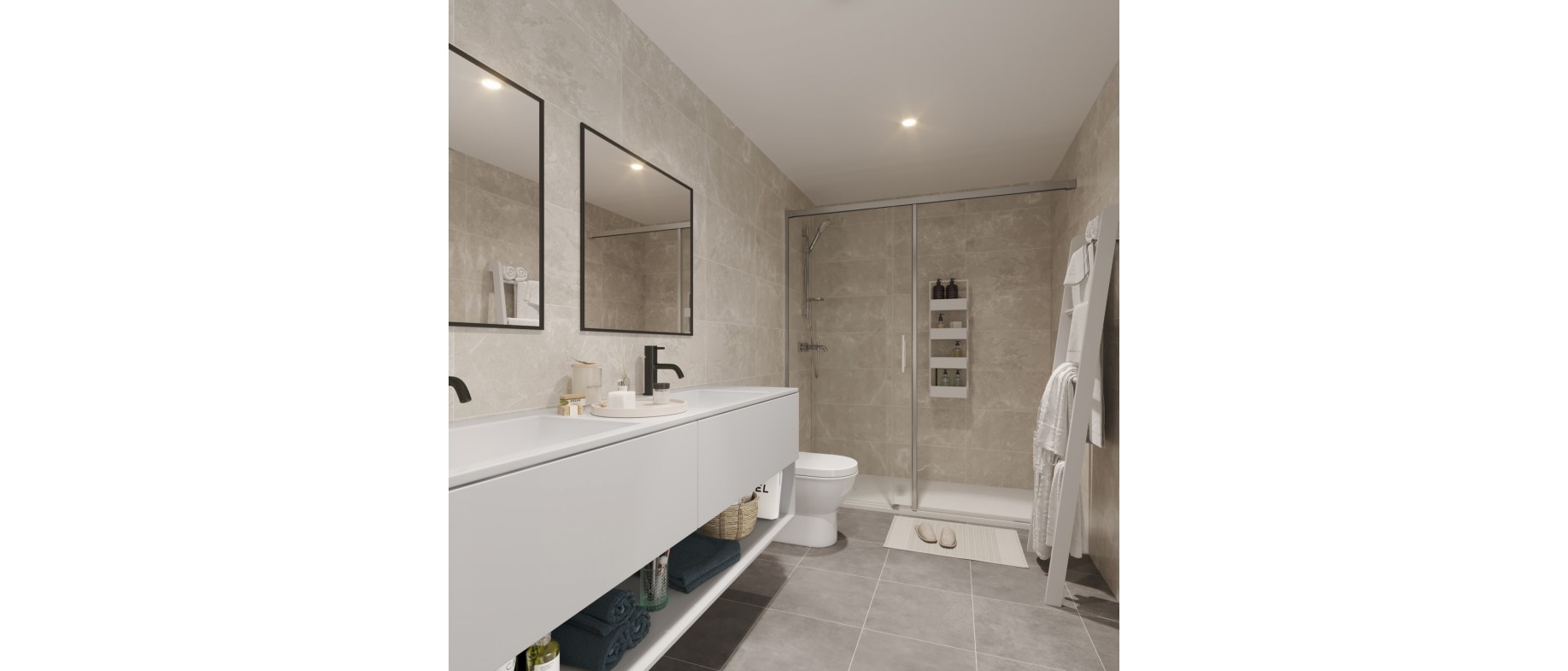 Distribución igual que la actual, con la salvedad de elección entre bañera o plato de ducha. Sanitarios marca Roca , modelo The Gab y pulsador encastado en color blanco. Muebles de baño en color blanco. Plato de ducha de medidas personalizadas y color blanco , de resina con rejilla inoxidable nuovo cuadrada. Columna termostática en baño principal.